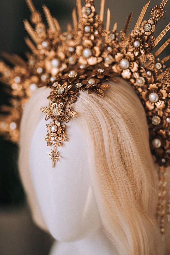 Let your light shine with this luxurious gold halo crown, hand-embellished with intricate florals, glistening pearls, and radiant sunbursts. A true masterpiece of celestial beauty, this crown was made for women who embrace their divine essence and love to stand out on their most sacred days.