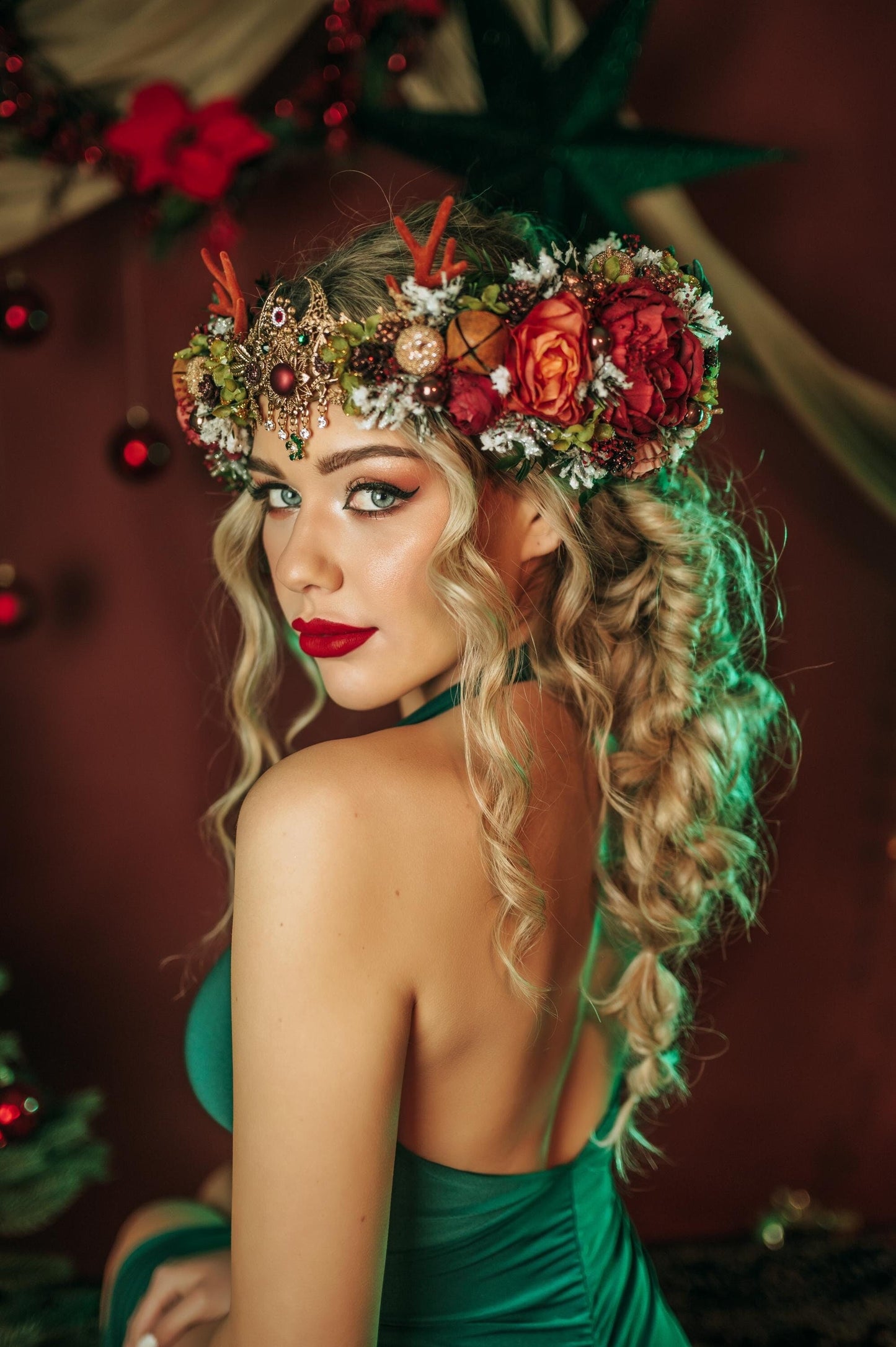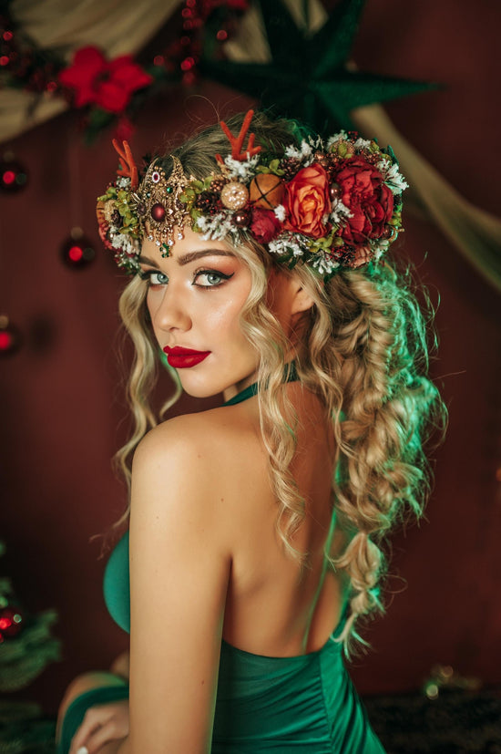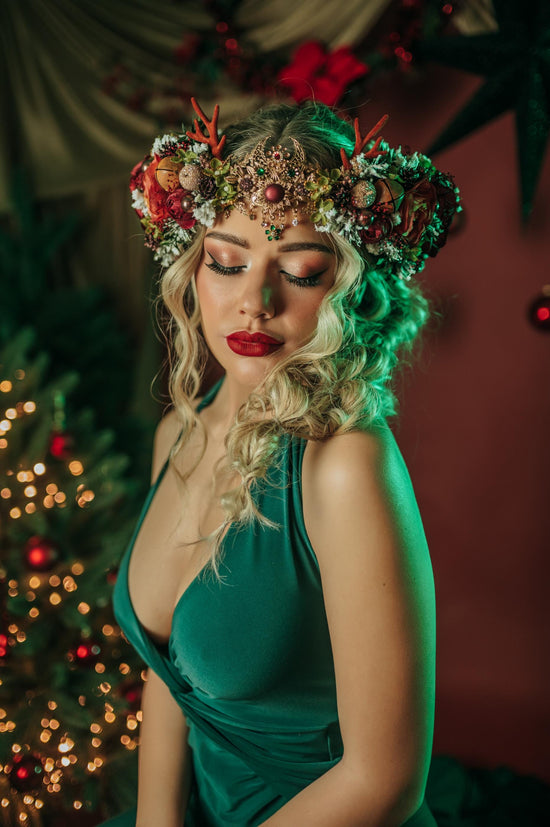 A love letter to your winter magic. This crown invites you to step into a world where festive colors glow like warm candlelight and every petal, gem, and frosted detail becomes a whisper of enchantment. With deep red roses, winter greenery, shimmering gold accents, and gentle antlers symbolising strength and femininity, this piece wraps you in a story of beauty, celebration, and divine presence. ❤️