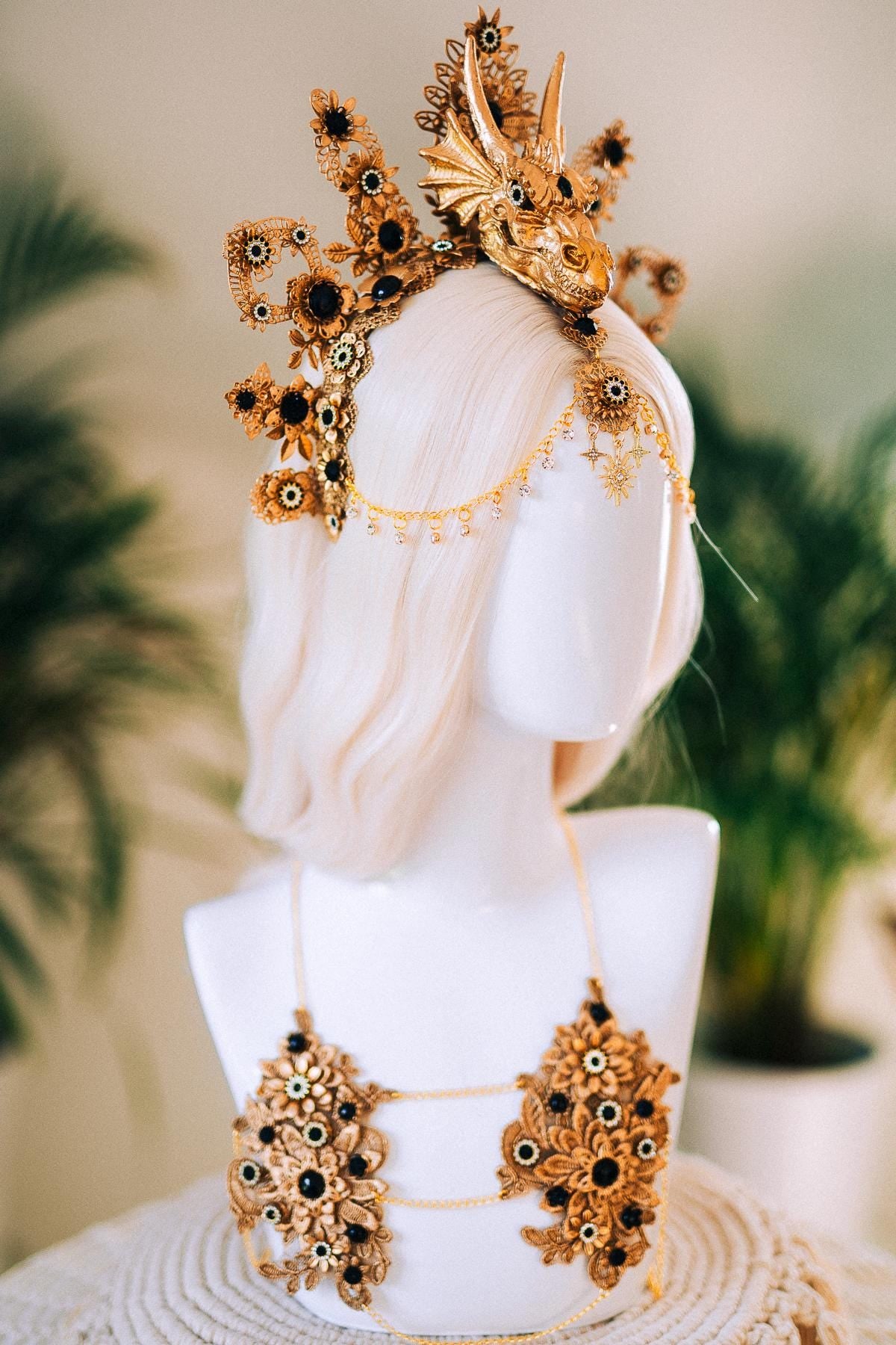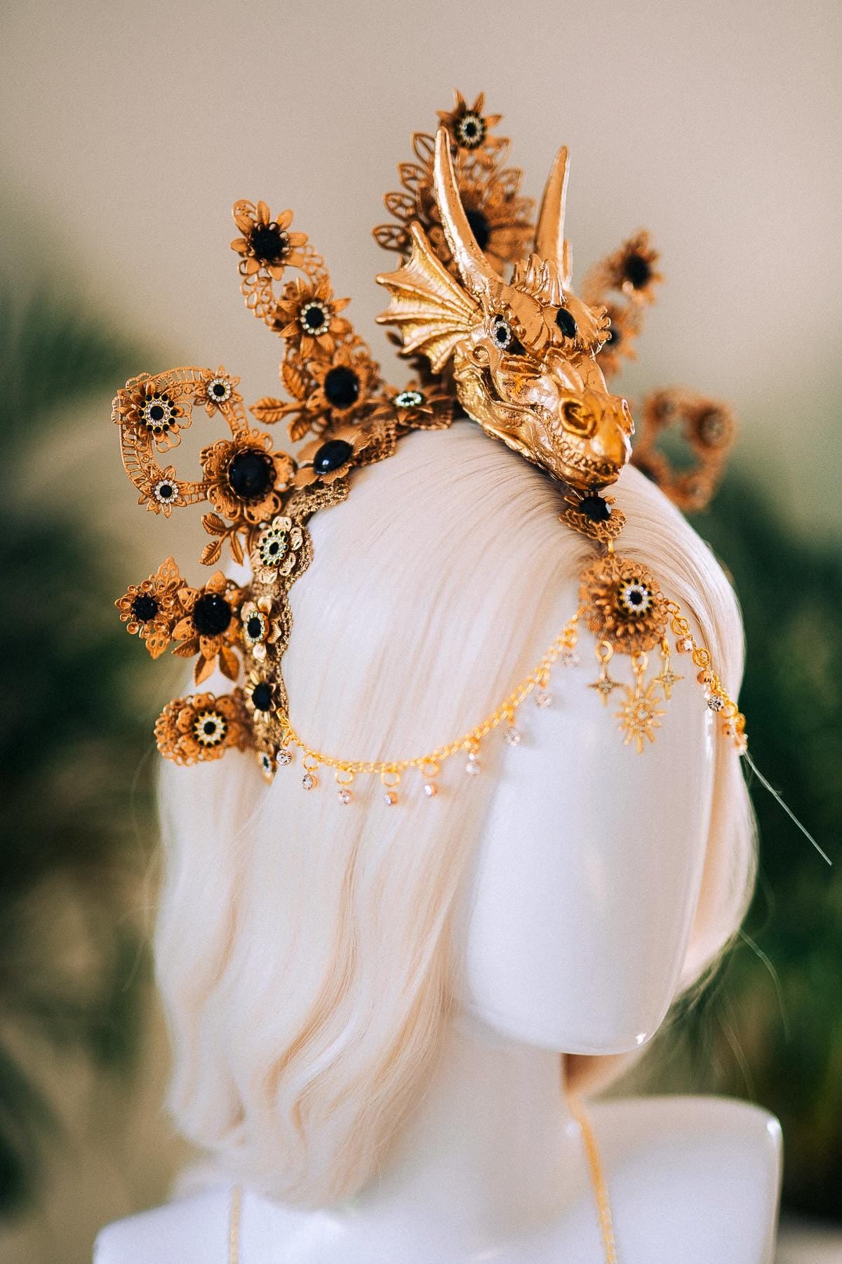 Unleash ancient power with this breathtaking handcrafted dragon crown — a mythical fusion of divine femininity and untamed fire. At the center, a sculpted golden dragon rises like a guardian of your soul, crowned in celestial florals and obsidian gems that shimmer like volcanic glass. Surrounding the beast, delicate baroque lacework and enchanted blossoms bloom in a fiery halo, honoring your strength, sensuality, and inner magic. 🐉