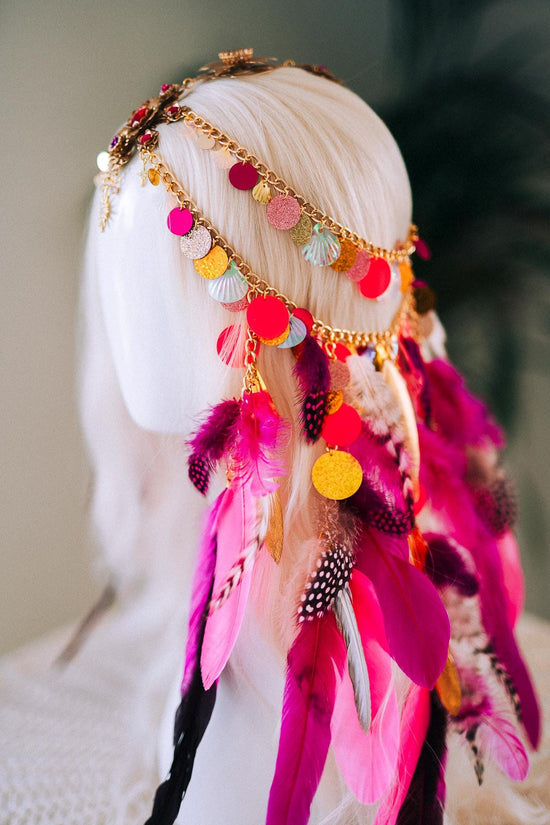 Dive into the rhythm of the desert with this hypnotic festival headpiece, drenched in magenta, fuchsia, fiery orange, and bold gold. Layers of vibrant feathers, shimmering sequins, and playful coins create an untamed cascade that moves with you — wild, radiant, unforgettable. Perfect for Coachella, Burning Man, carnival parades or ritual dance ceremonies, this headdress is made for bold hearts and bohemian queens. 🪶✨