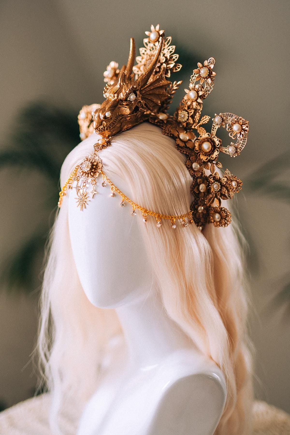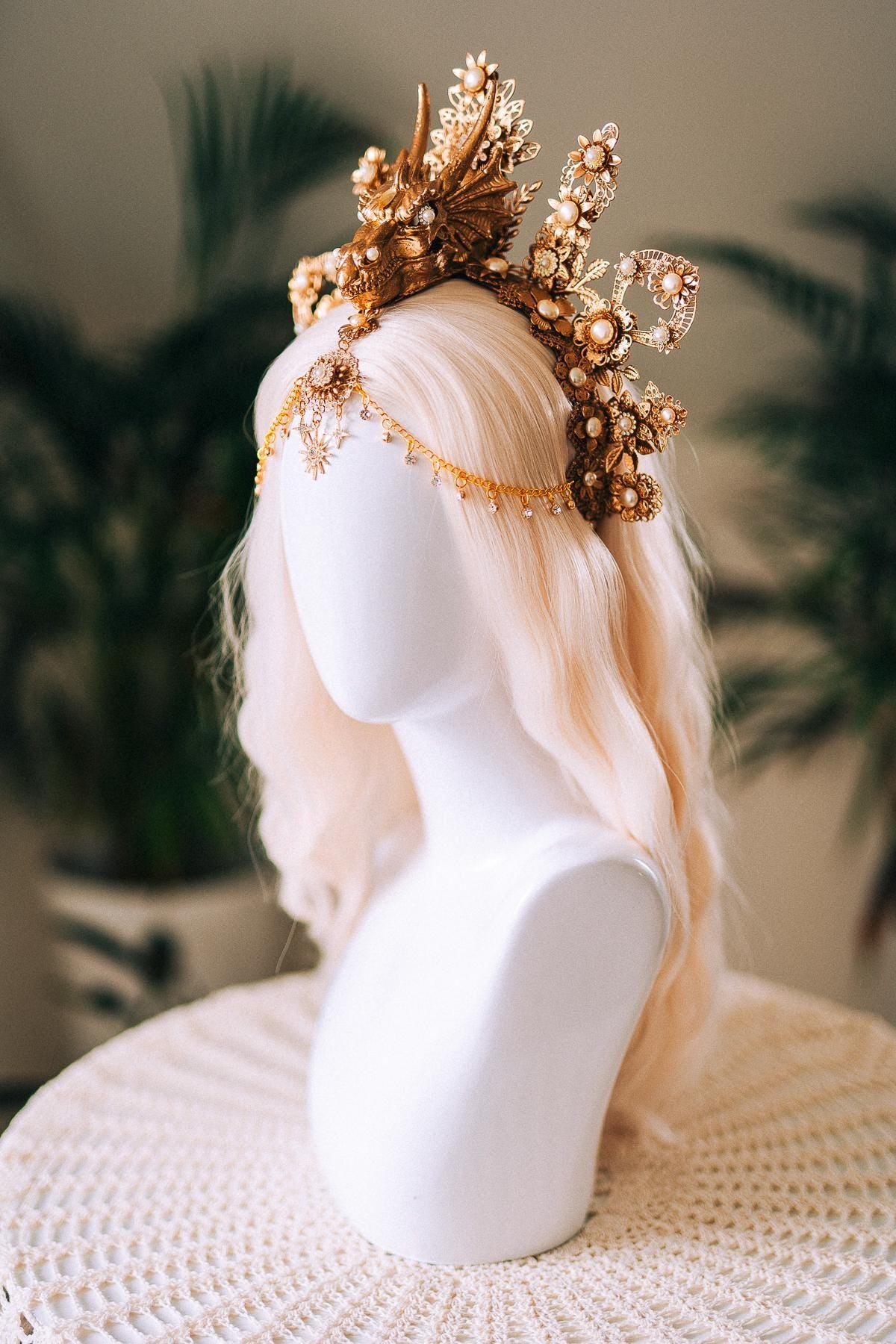This golden dragon crown is a divine heirloom for the chosen. A majestic beast coils above your brow, flanked by baroque floral wings, hand-wired pearls, and glints of celestial gold. Sun charms dance across your skin like prophecy. Each detail is forged to awaken the ancient fire within. 🔥