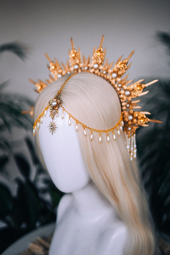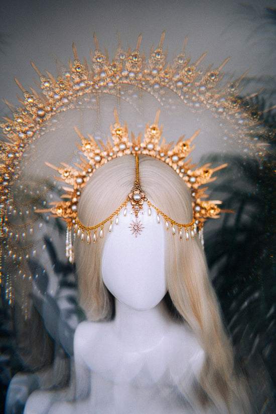 Each detail is lovingly handcrafted, honoring quality, femininity, and artistry. Pearls, golden filigree, and delicate draping blend into a harmonious, ethereal design that turns your aura into a luminous halo.