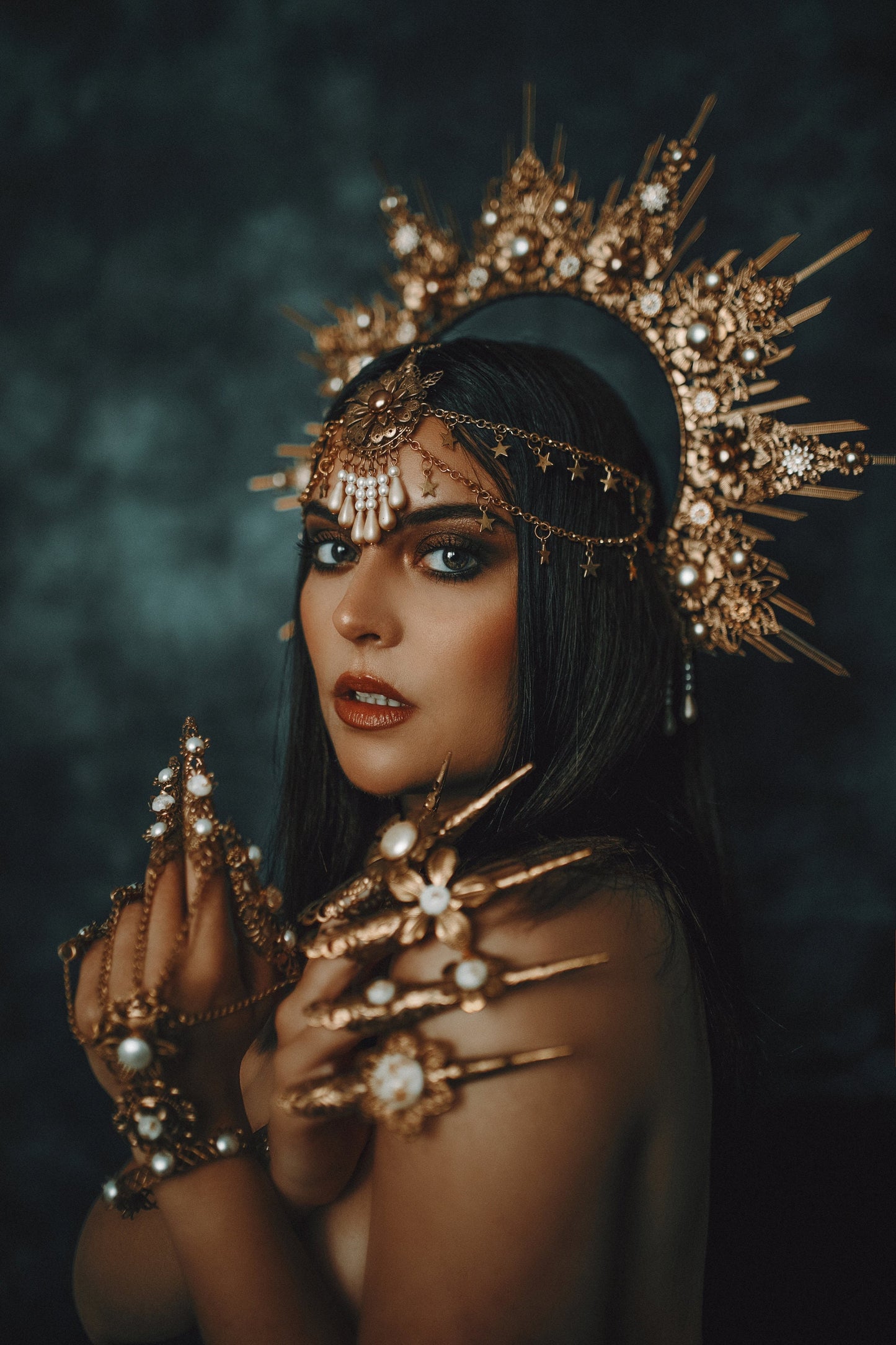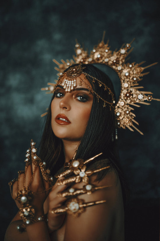 Beloved goddess, this crown is created for the woman who carries fire in her eyes and galaxies in her heart. When you place it upon your head, your aura shifts — soft, radiant, irresistible. Its golden architecture and luminous pearls frame your face like a rising dawn, turning every gesture into poetry.