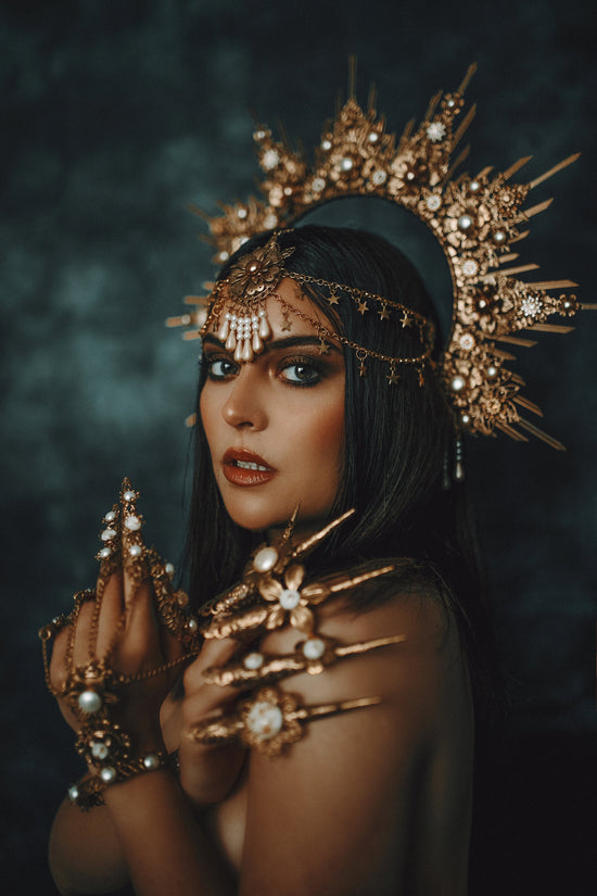 Handcrafted with devotion, this Halo Crown shines beautifully in bridal portraits, goddess sessions, maternity photoshoots, editorials, galas, and ceremonial moments. Each detail is shaped to honor your femininity, your strength, your softness — all at once. Let this crown accompany you as you transform, celebrate, and embody the most luminous version of yourself. 🌞