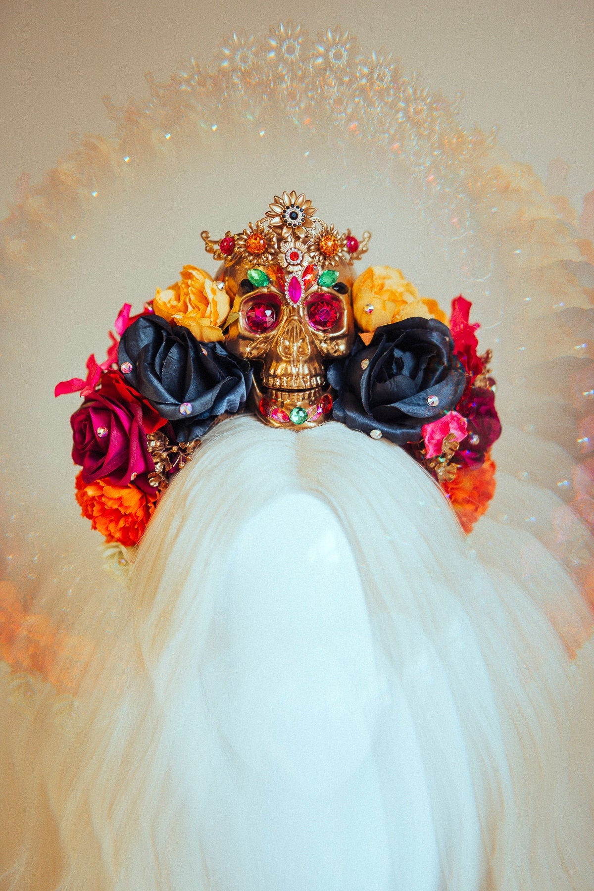 Step into the spirit of Día de los Muertos with this golden skull crown, a true celebration of La Catrina’s elegance. Adorned with deep burgundy, black, orange, yellow, and green roses, shimmering crystals, and an intricately detailed golden skull centerpiece, this headpiece embodies the beauty of Mexican folklore. A masterpiece for Halloween, carnival, or festival looks, bringing regal and mystical energy to your ensemble. 💀🌹✨