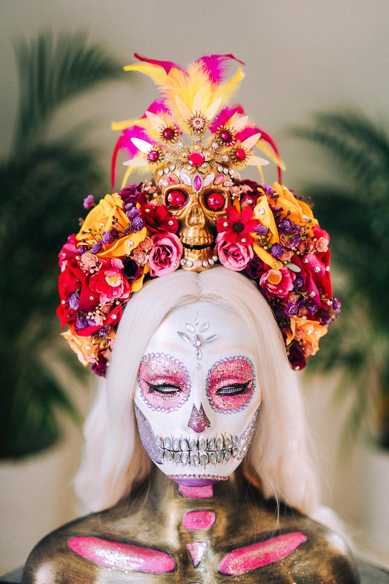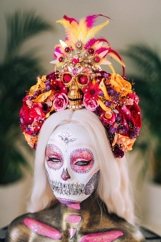 🌺 Día de los Muertos Crown With Golden Skull & Feathers 🌺
