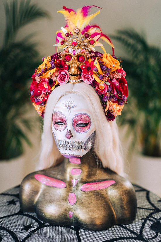 Each petal, gem, and feather carries intention — for those who dance between worlds with devotion in their heart and art on their body. Whether you wear it for your Día de los Muertos celebration, for Halloween, or a themed photoshoot, this crown is designed to awaken awe and pay tribute with reverence and joy. 👑