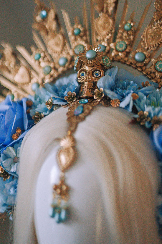 Step into sacred celebration with this ethereal La Catrina crown in heavenly blue tones. Golden rays burst from a skull centerpiece adorned with turquoise crystals, framed by lush blue roses and lace details that cascade like a blessing. A radiant crown for ceremonies of remembrance, fierce femininity, and timeless transformation. 💀🌸