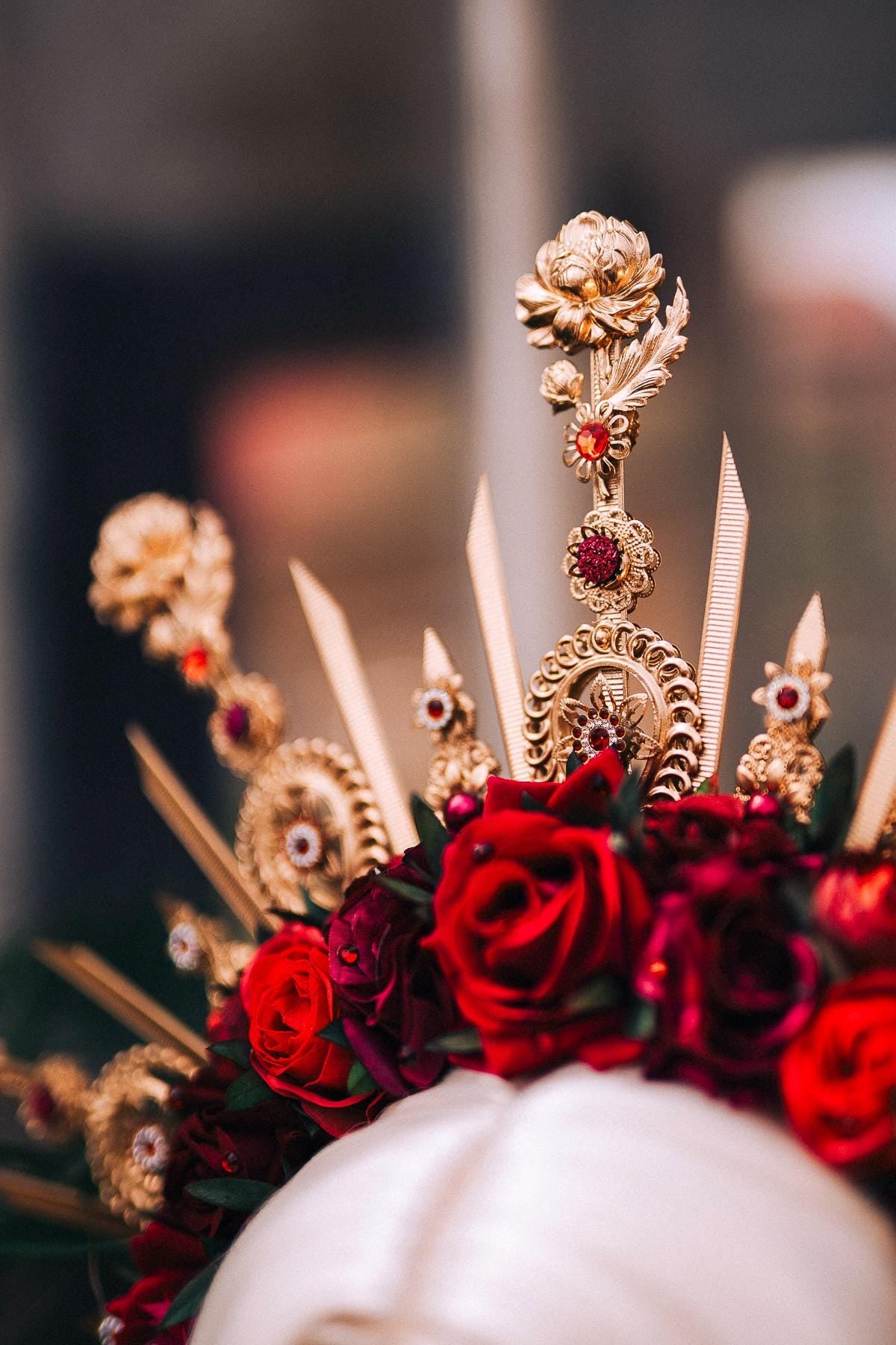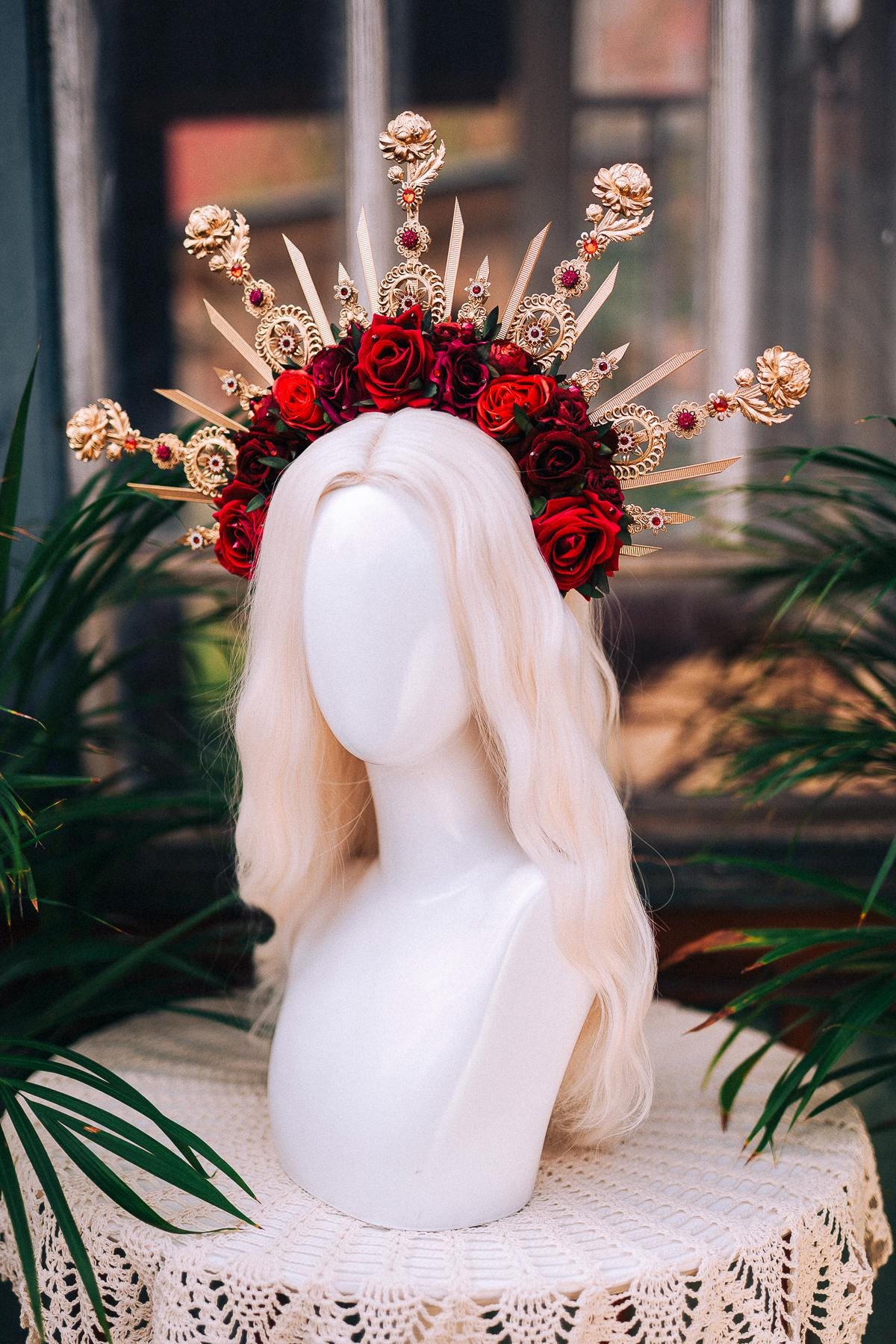 This radiant crown is a bold celebration of feminine power, handcrafted with deep red roses and luxurious golden ornaments that rise like rays of sunlight. Perfect for brides, goddesses, and festival queens, this design blends floral romance with majestic regality. Whether you’re walking down the aisle, capturing dreamy maternity photos, or ruling the dance floor at a carnival, this piece transforms your presence into pure magic. 🌿