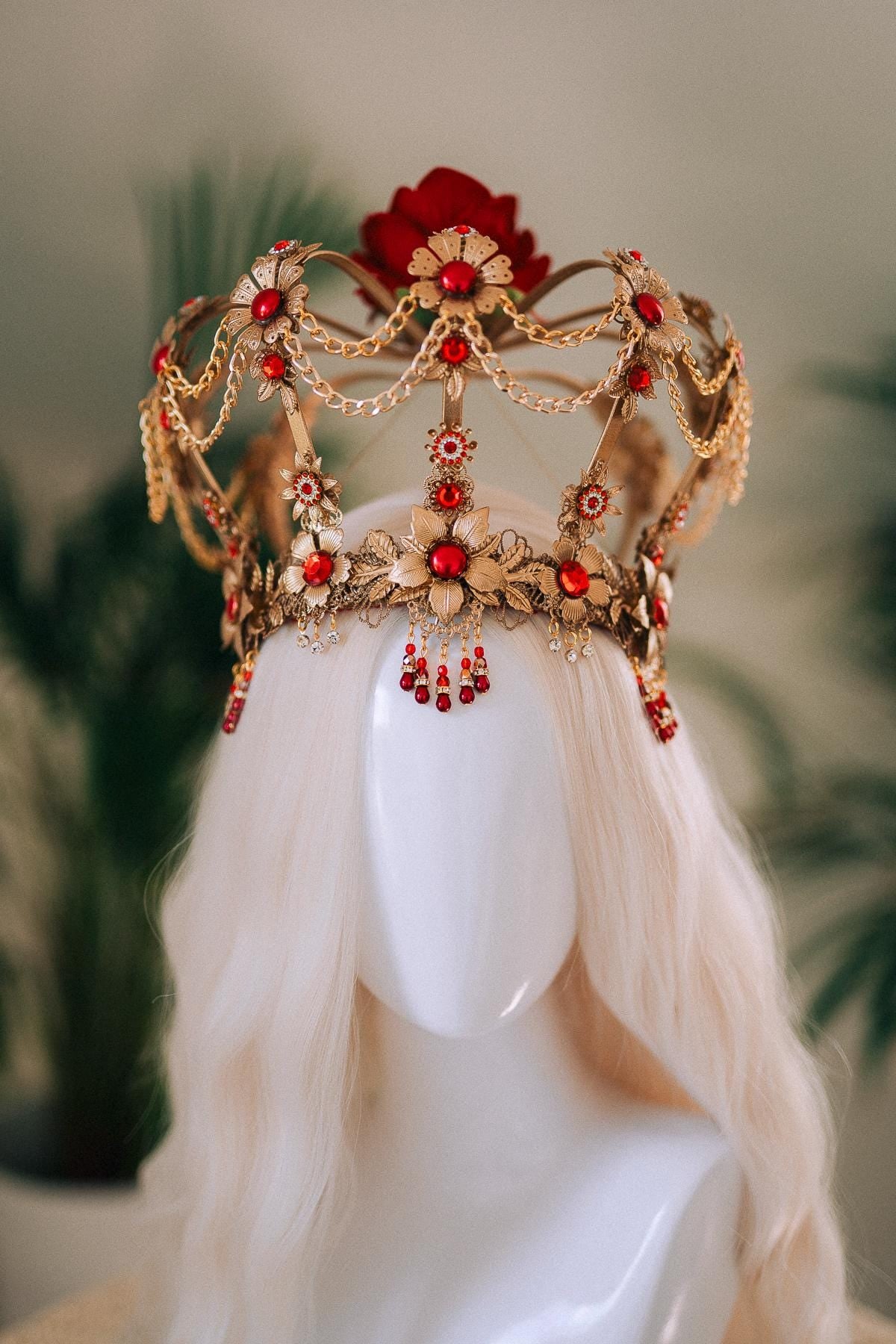 This majestic tall crown radiates with golden floral filigree, ruby red crystals, and cascading chain details — a luxurious piece handcrafted for goddess rituals, Halloween, fantasy weddings, festivals, or dramatic photoshoots. The regal architecture of this crown evokes the spirit of ancient queens and high priestesses, bringing fierce elegance to every ceremonial look. 👑