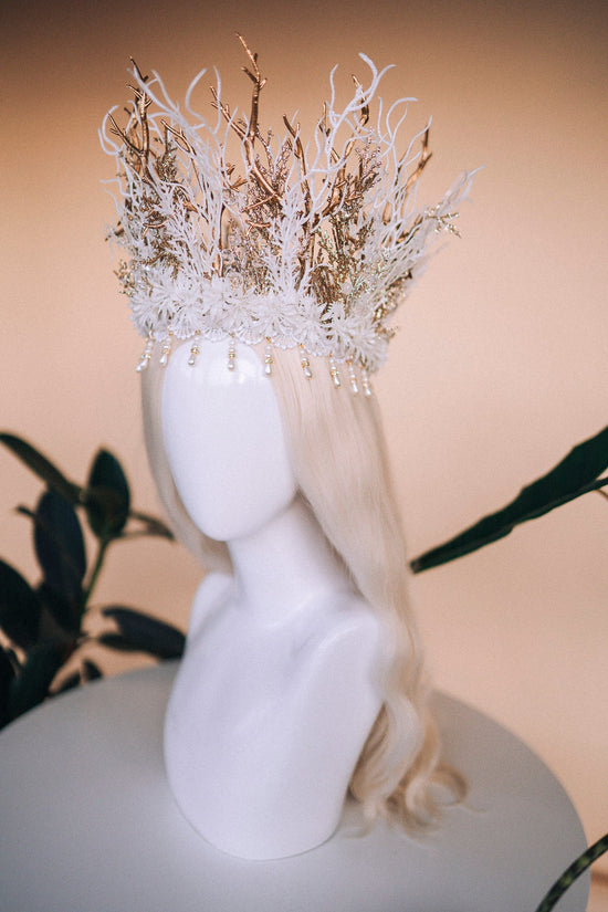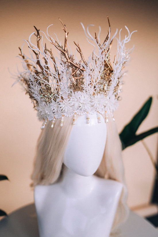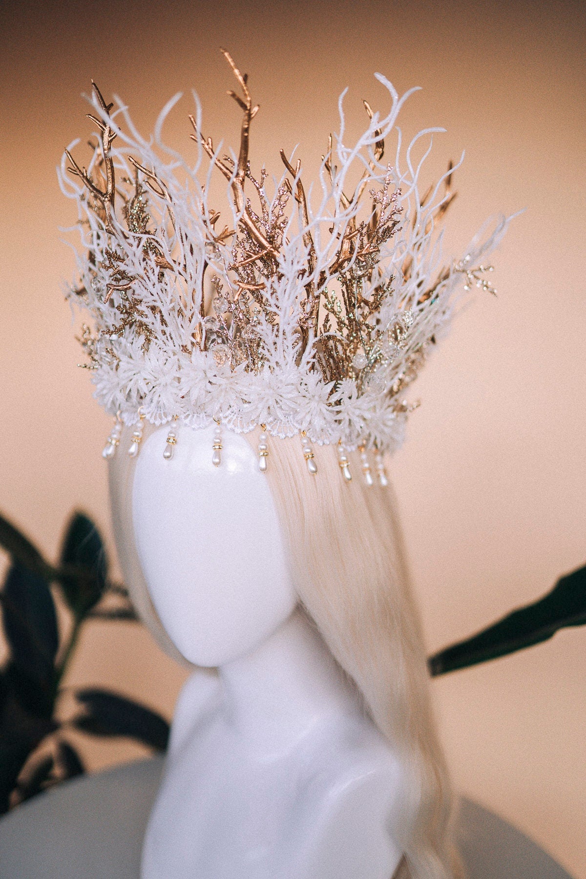 Step into a realm of icy beauty with this breathtaking winter crown — a shimmering creation of snow-white branches, golden antlers, and delicate frosted florals. Inspired by the purity of snow and the radiance of starlight, it captures the ethereal essence of a Winter Queen. 🤍